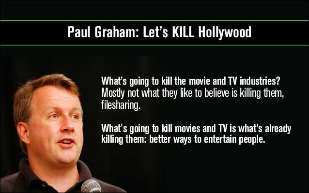 2012年1月份,美国风险投资家 Paul Graham 发表了一封公开信,题目很夸张,叫做“摧毁好莱坞”(kill Hollywood)。他希望创业公司投入娱乐行业的创新,跟好莱坞一比高下,甚至取代它。